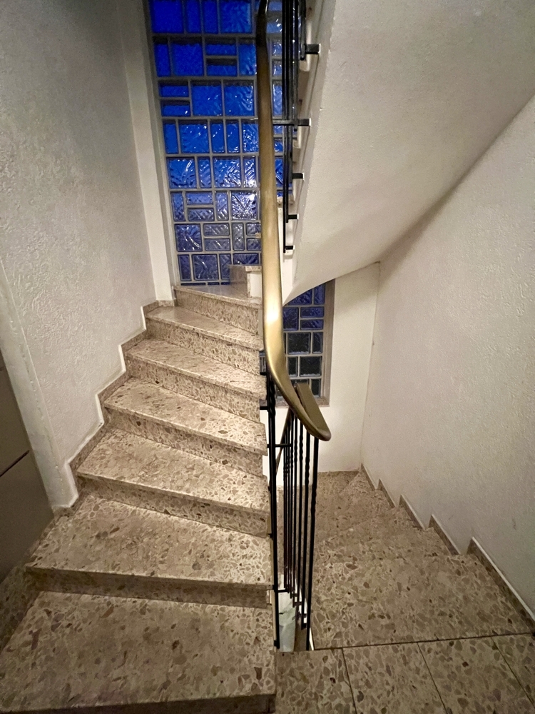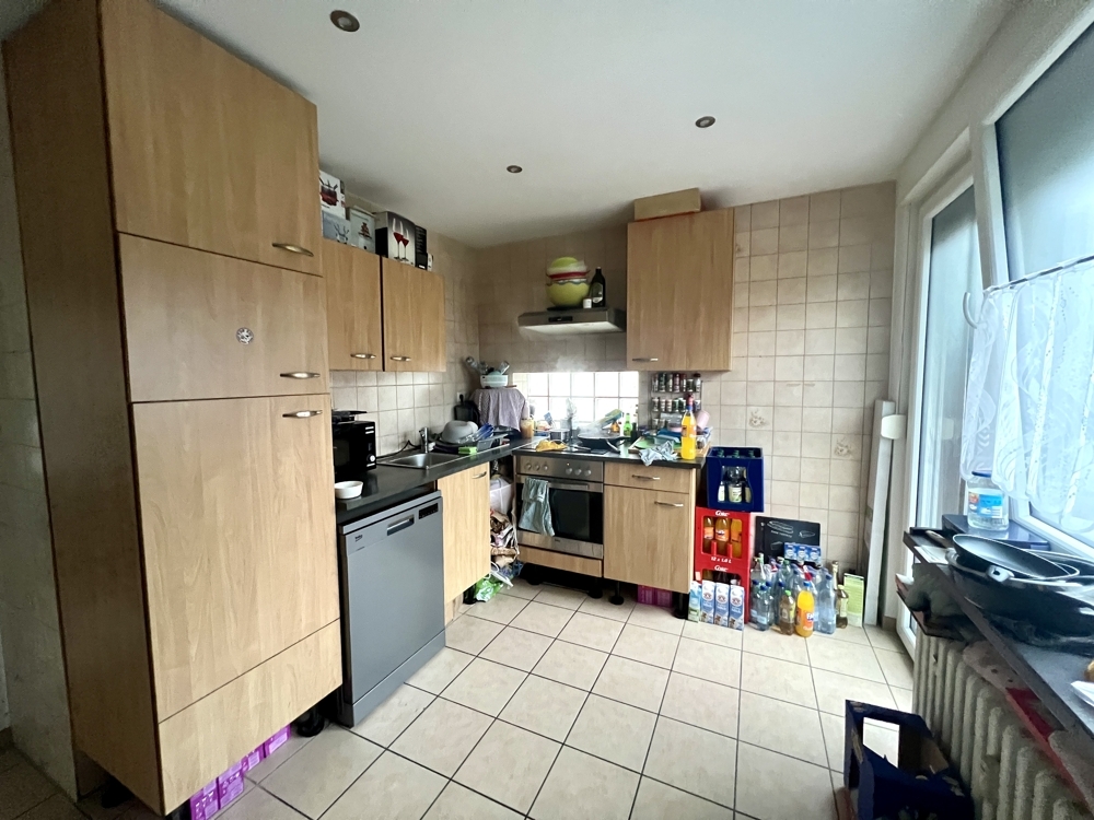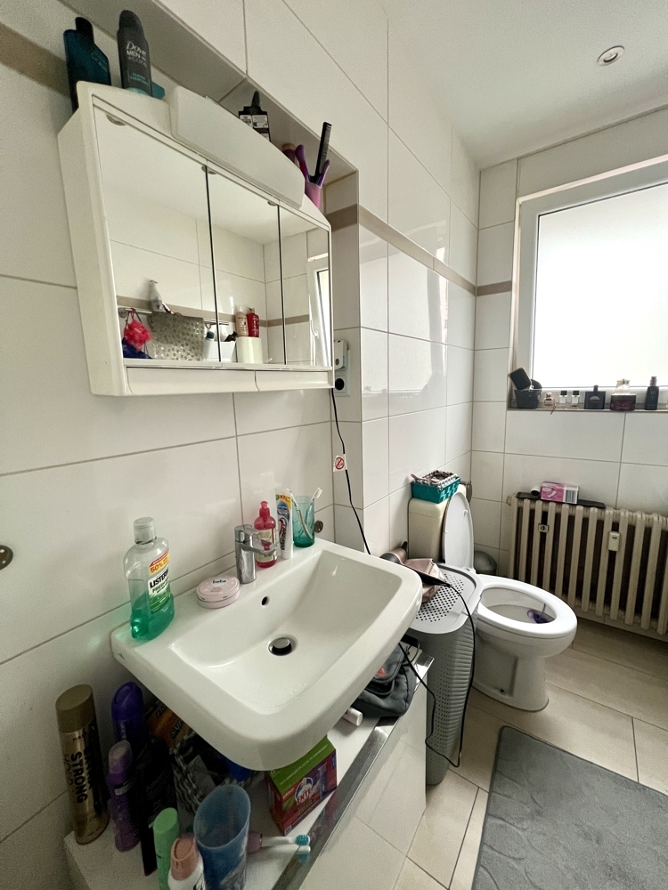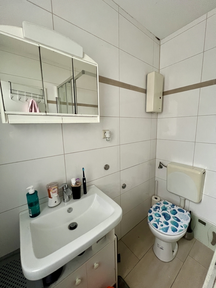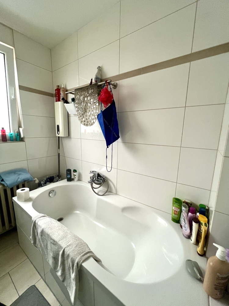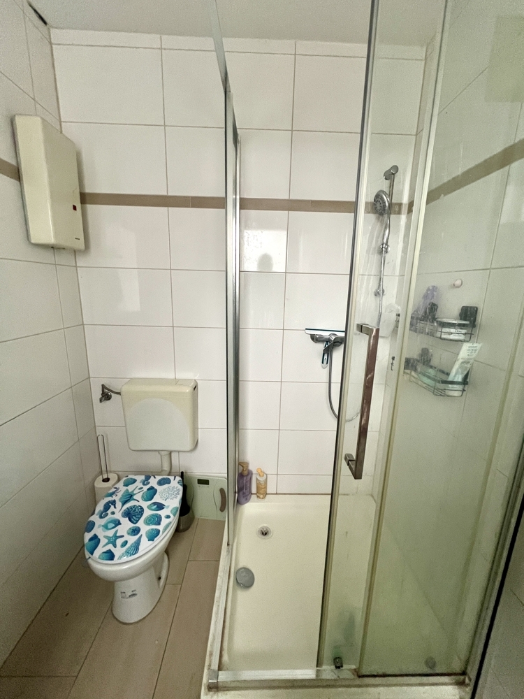 In der Wohnung im DG wurde ebenfalls ein terracottafarbener Fliesenboden verlegt. Das Tageslichtbadezimmer ist mit einer Dusche ausgestattet, stammt jedoch noch aus den 1970er Jahren.
